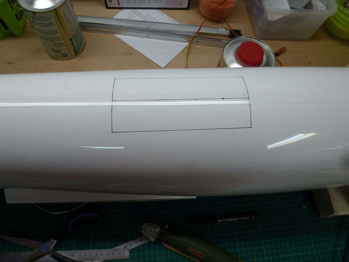 Zuerst hab ich die Fahrwerksklappe ausgemessen und ausgeschnitten. Danach das Einziehfahrwerk mit den Spanten eingepasst.