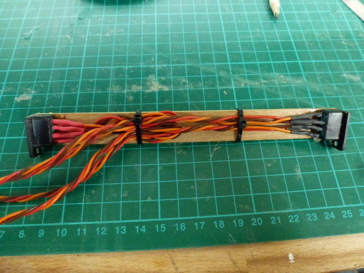 Die Verkabelung für die Querruder und Störklappen auf einen Spant montiert und eingeklebt.