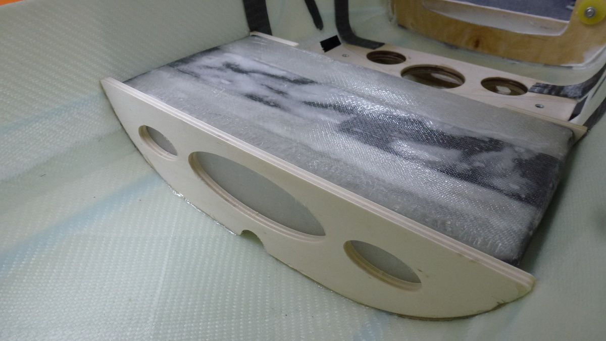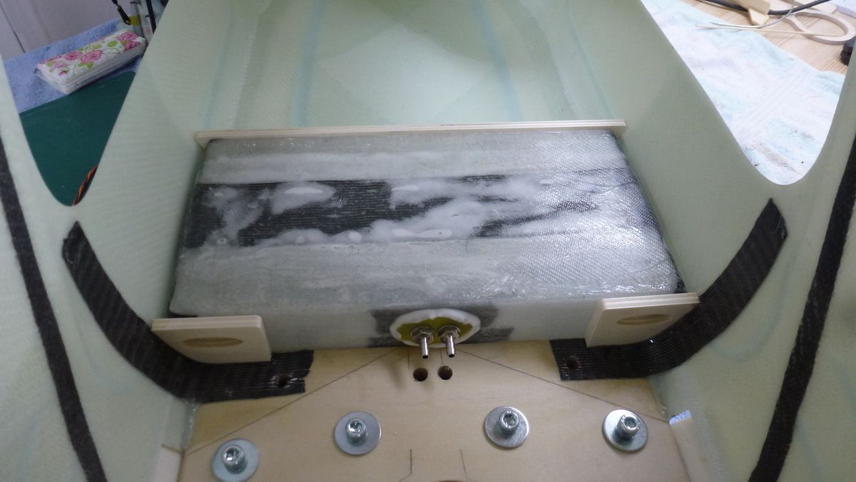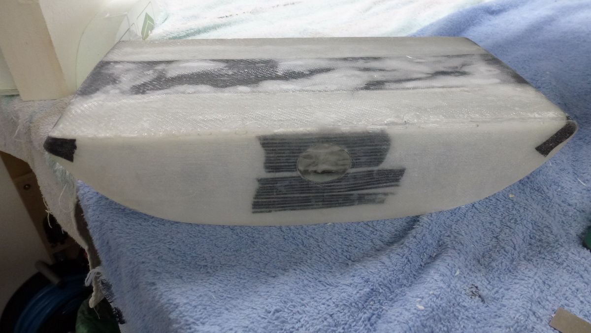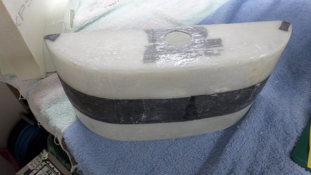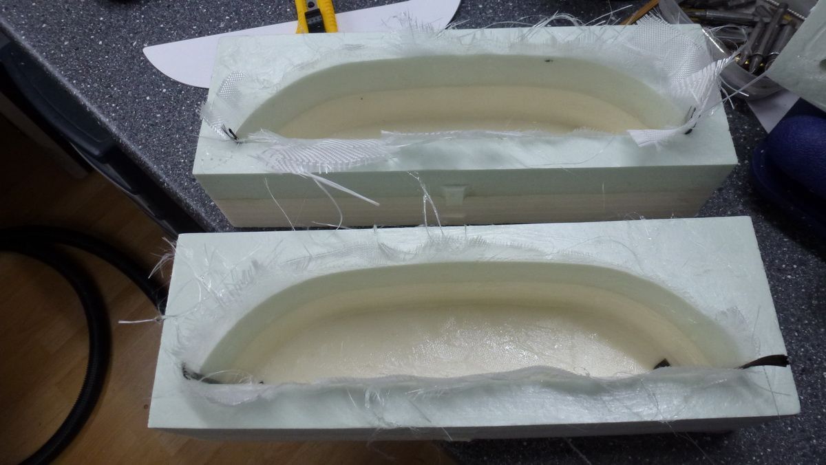 Dazu zwei Styrodur hälften gefräst mit Vaseline gut eingeschmiert und anschließend jede Hälfte mit Glasfaser und CFK Gewebe laminiert.